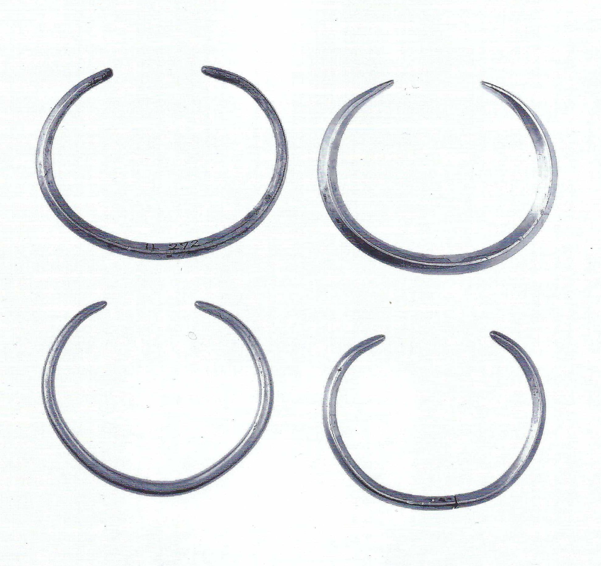 This bracelet is a reproduction of a type that is common in finds of Viking-age silver from Scotland. Examples are known from the Tarbat Hoard (see image), the Skaill Hoard, and the Port Glasgow hoard, as well as many others.