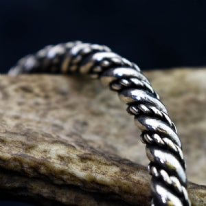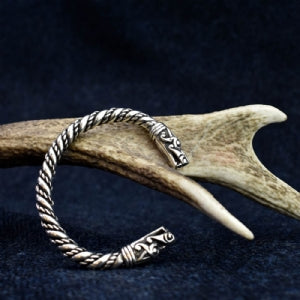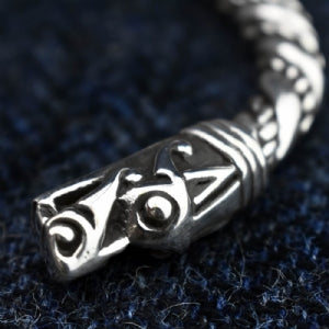A solid sterling silver bracelet that is based on jewellery from the Viking age. The armlet is chunky, yet highly detailed with dragon head terminals at each end.