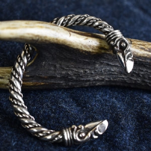 A 925 solid silver bracelet that is based on silver ones from the Viking age. Chunky, yet highly detailed with Odin's raven head terminals at each end. Odin's ravens were called Hugin and Munin - Thought and Memory.