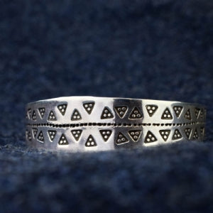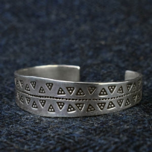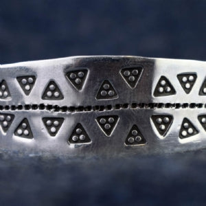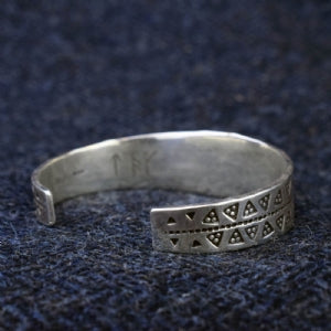 This cuff is loosely based of one found in the Cuerdale Hoard, the largest silver Hoard found outside of Russia. The Cuerdale Hoard was unearthed in Lancashire and contained an astonishing number of items. The cuff has been hand made using traditional Viking techniques by our head craftsman, Jim, and each is one of a kind.