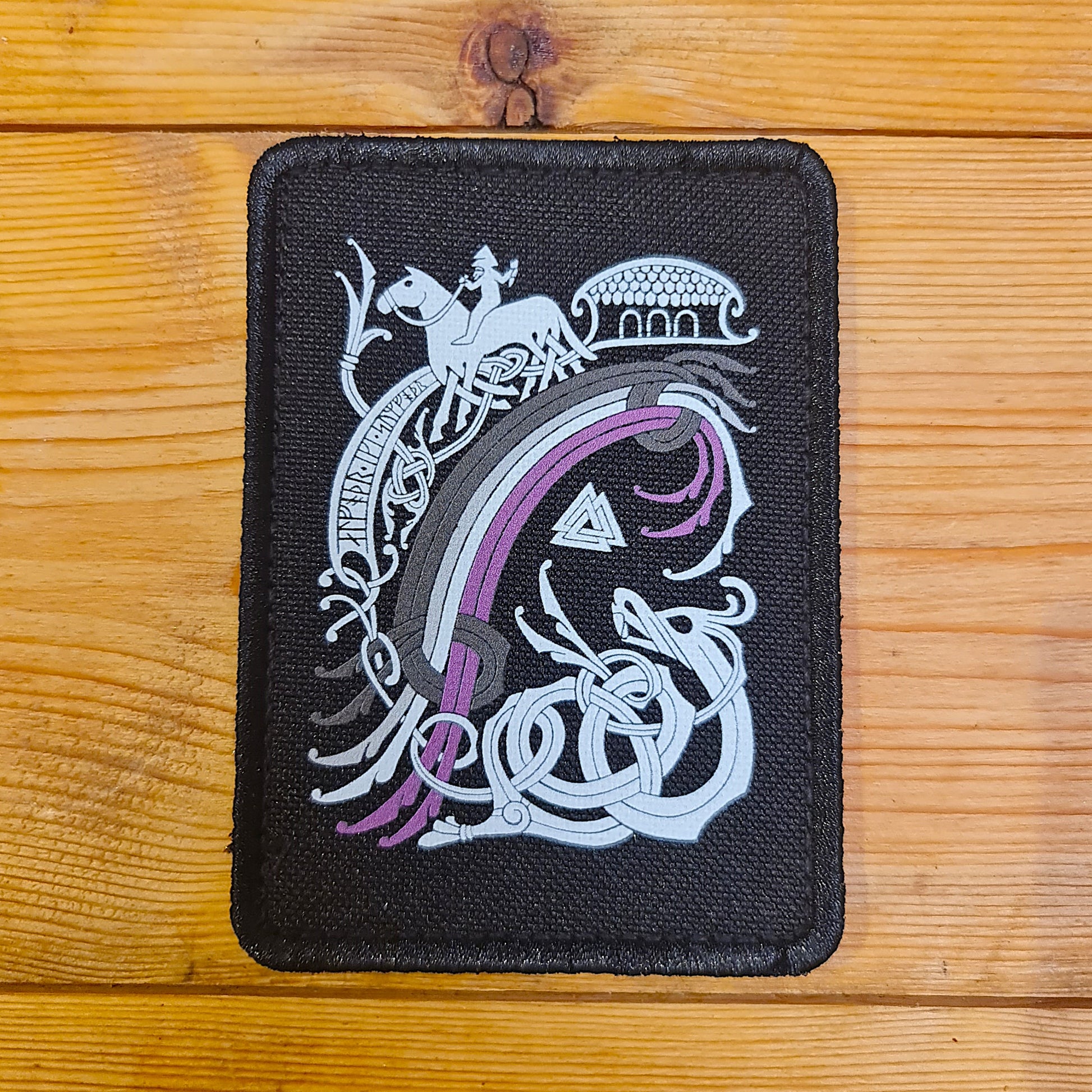 Our popular Bifrost deisgn in the colours of the asexual flag printed onto a velcro backed patch.