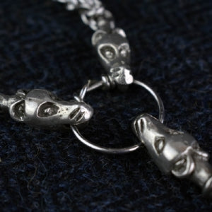 The pendant is attached to the chain by a stainless steel ring and pewter dragon heads. The chain is stainless steel and based on designs from the Viking period.
