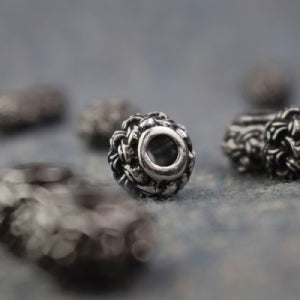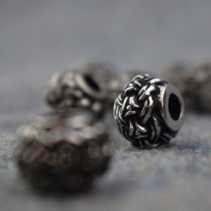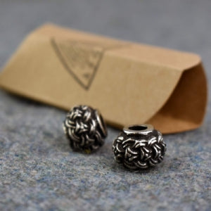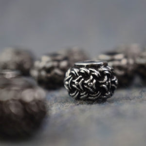 This pewter bead has the ring-chain motif on it that is commonly seen in Viking age art of the Borre style. It has a hole of 6mm so that it can be used on beard or hair braids.
