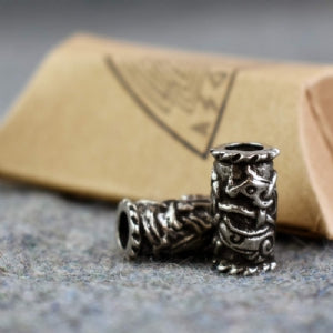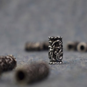 This pewter bead has a Viking beast depicted in the Jelling style winding its way around the cylindrical form of the bead. It has a hole of 6mm so that it can be used on beard or hair braids. It has a width of 10mm and a length of 16mm and also fits on our ABLET014 leather bracelet with Sterling silver fittings.