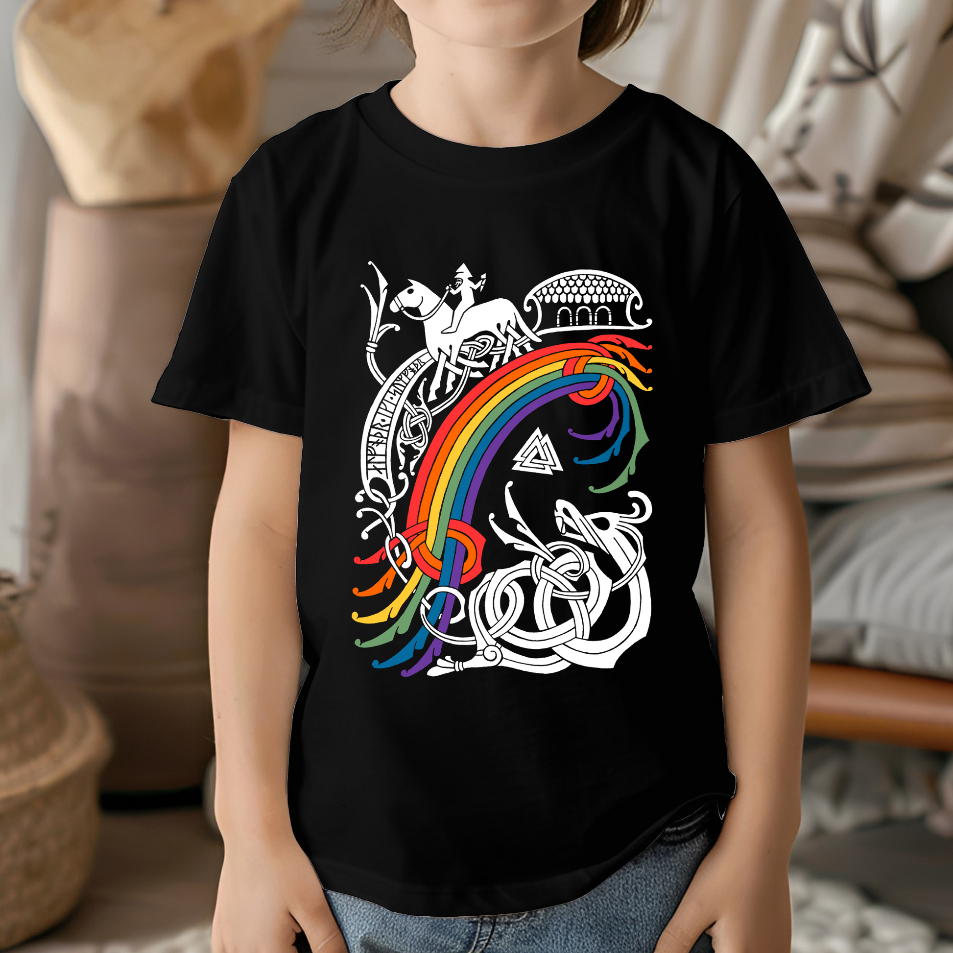 Our t-shirt shows Odin riding his eight legged horse Sleipnir down the Bifrost from Asgard to Midgard - represented here by the Midgard serpent, Jormungander. Both Sleipnir and Jormungander are children of the trickster god Loki. Jormungander by the giantess Angrboda, and Sleipnir with the stallion Svadilfari.