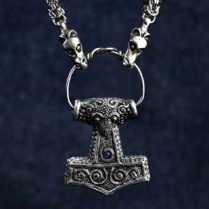 This stunning Thor's hammer pendant is a replica of one from the Viking period that was found in Skane, Sweden. The hammer and dragon heads on the chain are cast from pewter and the chain and hanging loop are both stainless steel.
