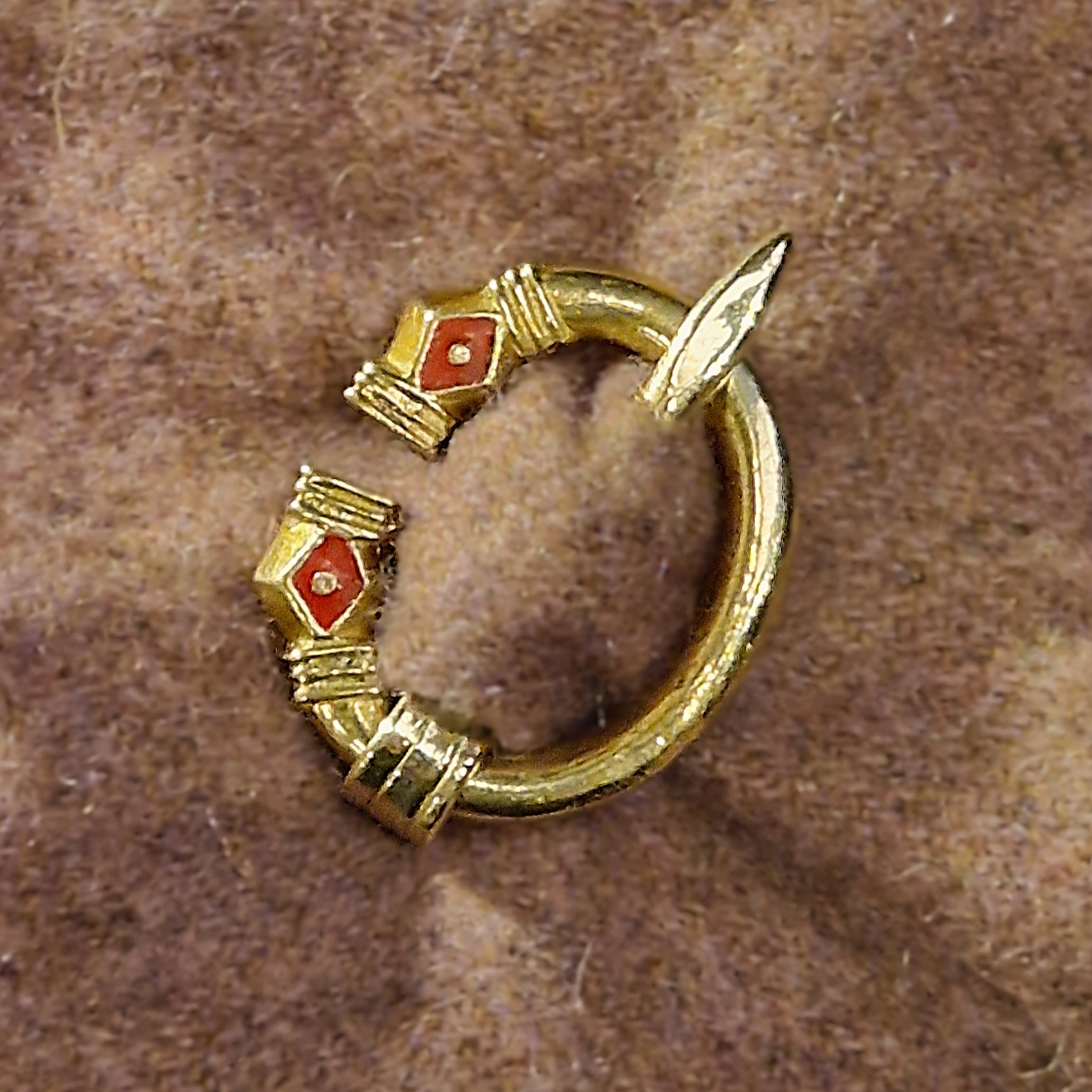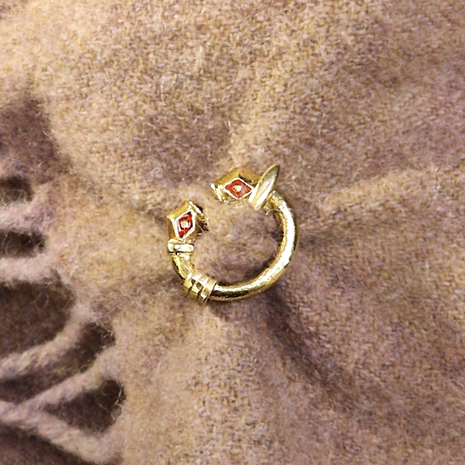 They are penannular brooches with faceted terminals defined by a collar at each end, reconstructed from clay moulds found at Dunadd. The lozenged recess has one circular pellet in the centre. We have interpreted this as being suitable for an enamel infill, which nicely brings out the colour of the circle in the centre. We have chosen red enamel for this, as this was a common colour of enamel used in early mediaeval Scotland.