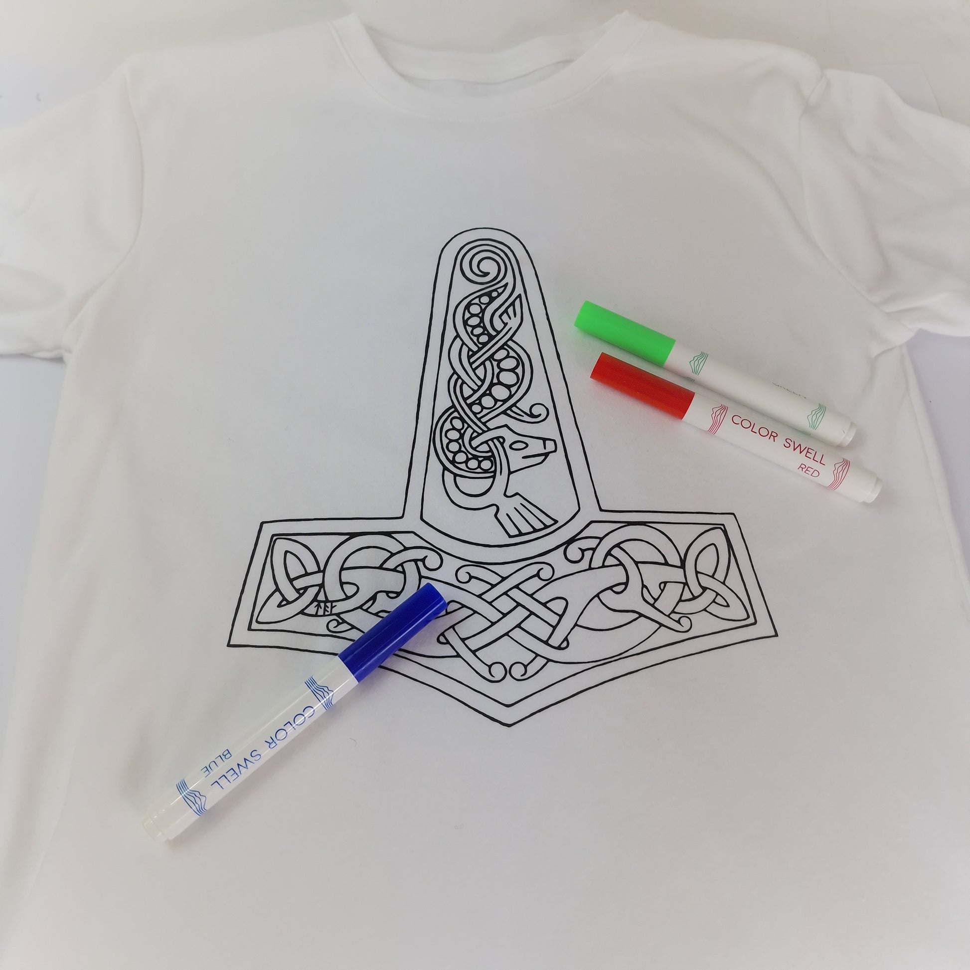 It comes with a set of 8 washable coloured pens. Simply wash this t-shirt and the felt tip is removed, so they can colour it in again and again.