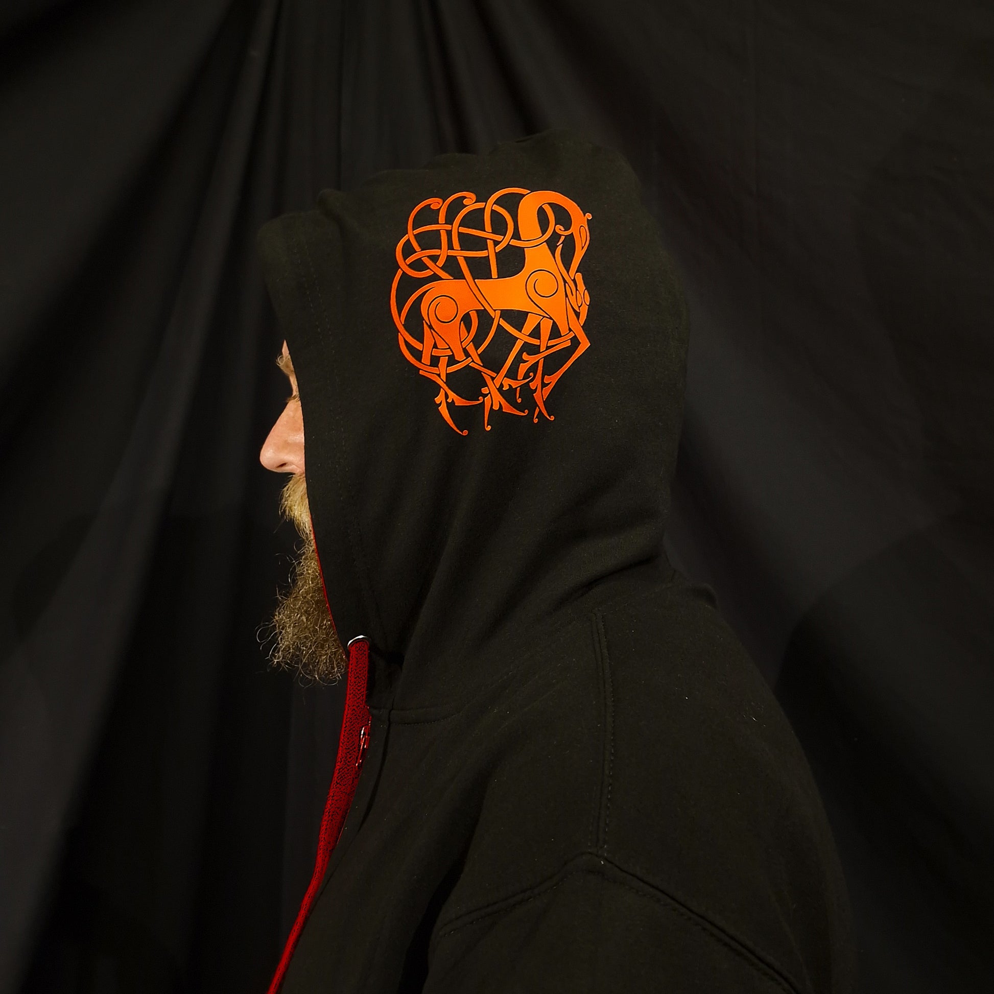 Another of this children, Sleipnir is depicted in the Urnes style as a small front print and as a hood print.