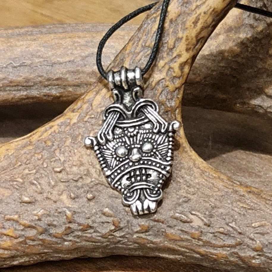 This pewter Loki mask pendant is based on a find from Øster Lindet in Denmark. The original was broken so we have added the missing parts by taking inspiration from other, similar pendants from Ulstrup in Denmark, and Härad and Uppåkra in Sweden.