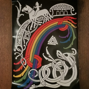 Our poster shows Odin riding his eight legged horse Sleipnir down the Bifrost from Asgard to Midgard - represented here by the Midgard serpent, Jormungander. Both Sleipnir and Jormungander are children of the trickster god Loki. Jormungander by the giantess Angrboda, and Sleipnir with the stallion Svadilfari.