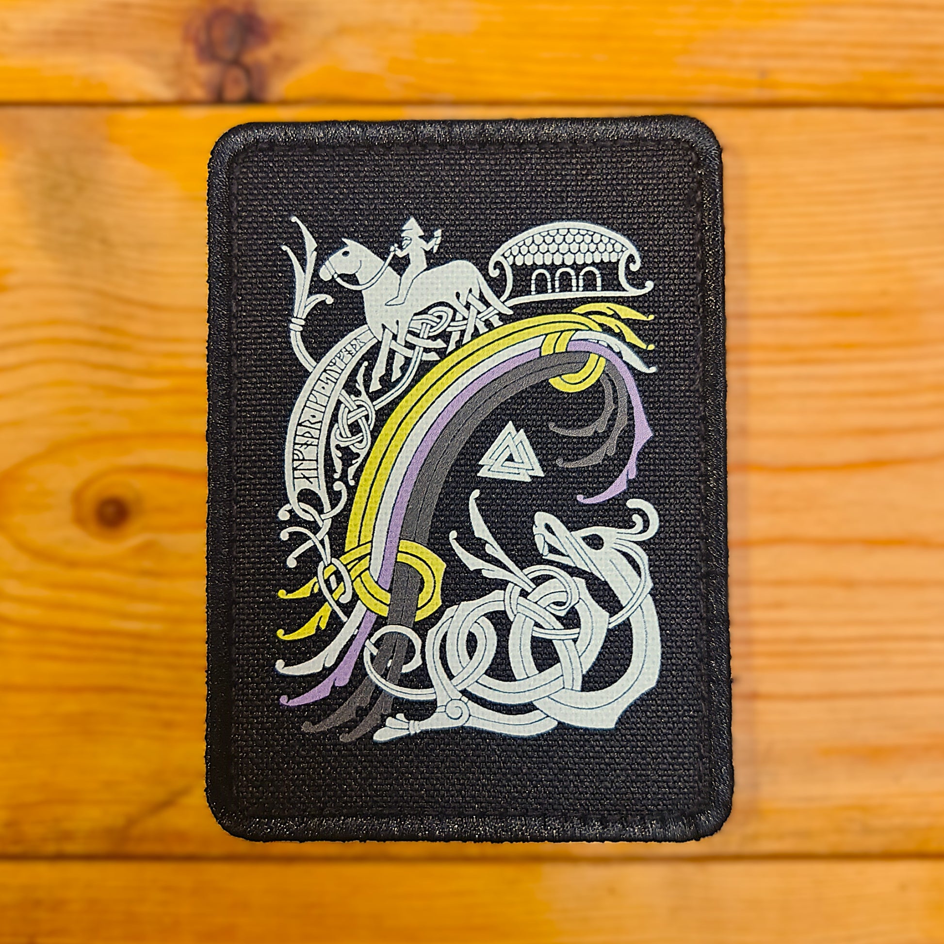 Our popular Bifrost deisgn in the colours of the non binary flag printed onto a velcro backed patch.