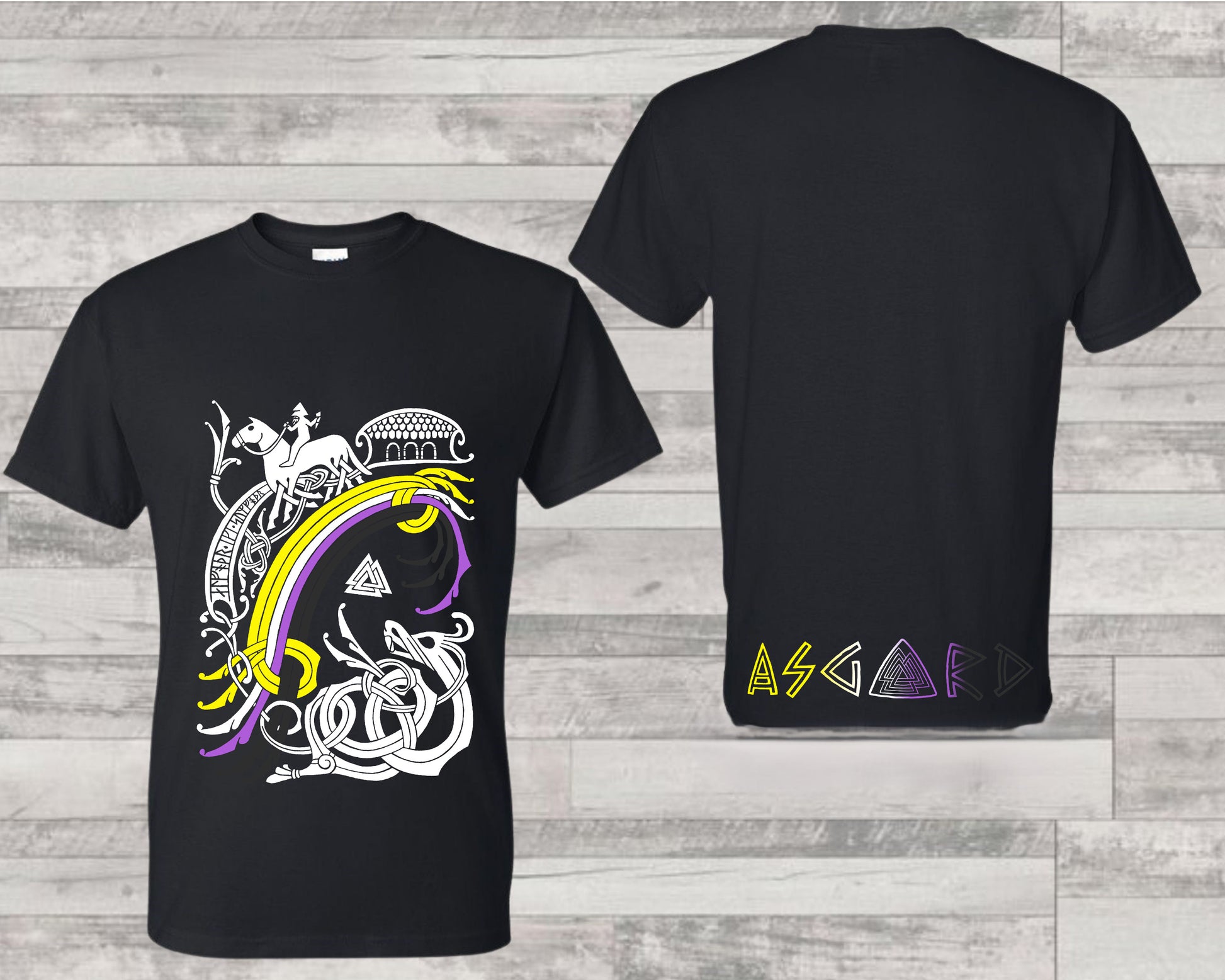 Our popular Bifrost t-shirt in the colours of the non-binary flag. Backprint is coloured to match.