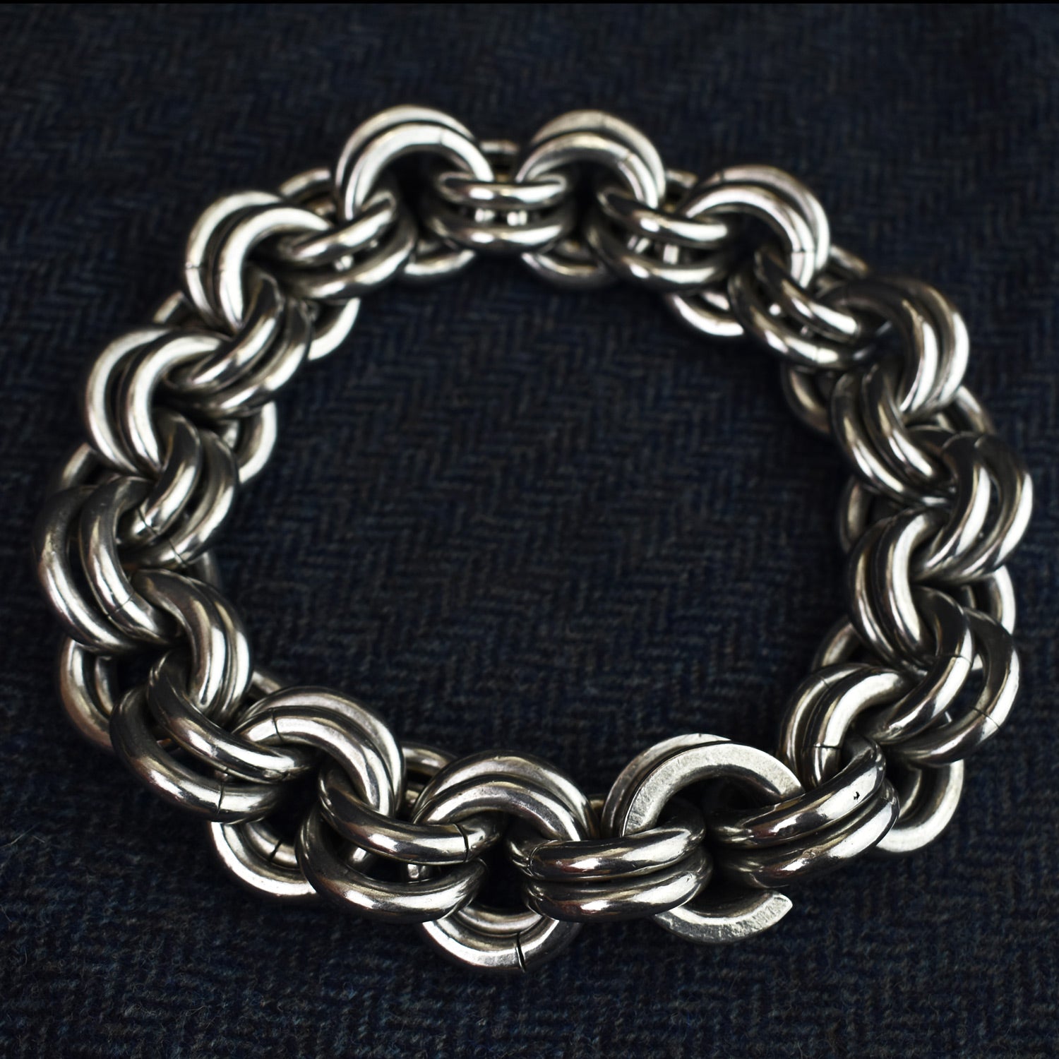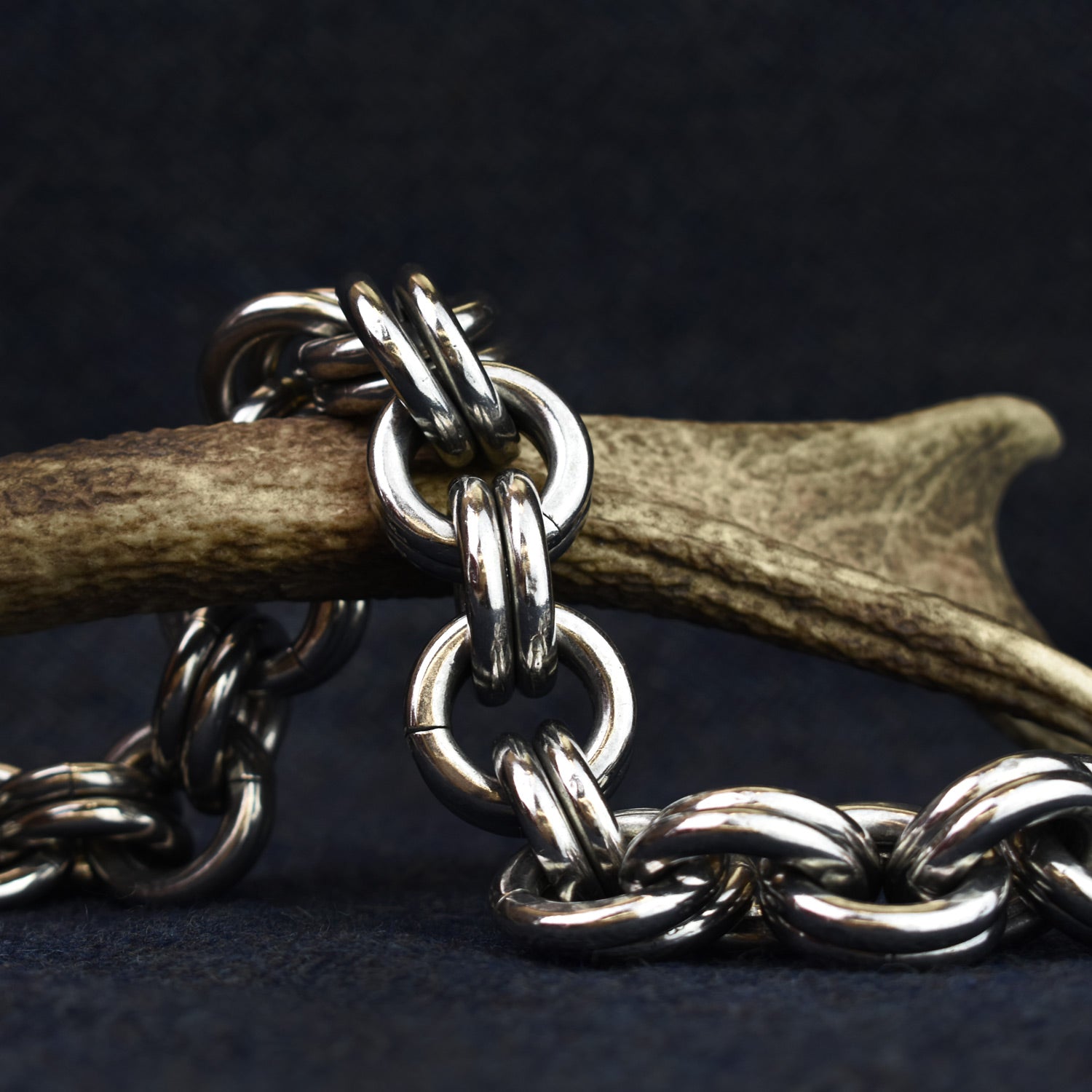 This heavy chain weighs 920g and measures aproximately 449mm in length and each ring has a diameter of 32mm.