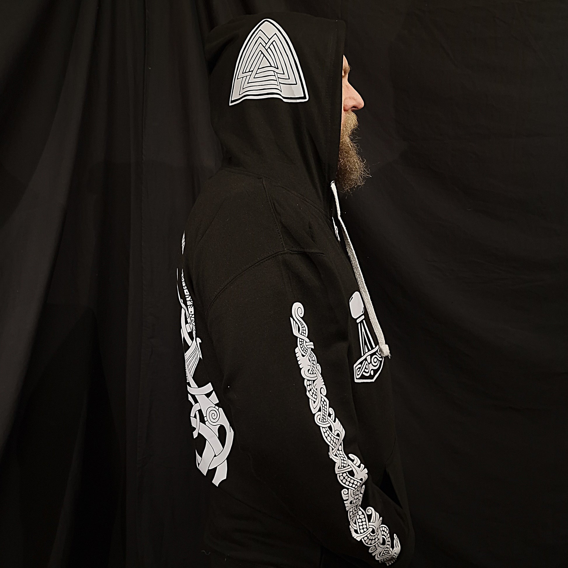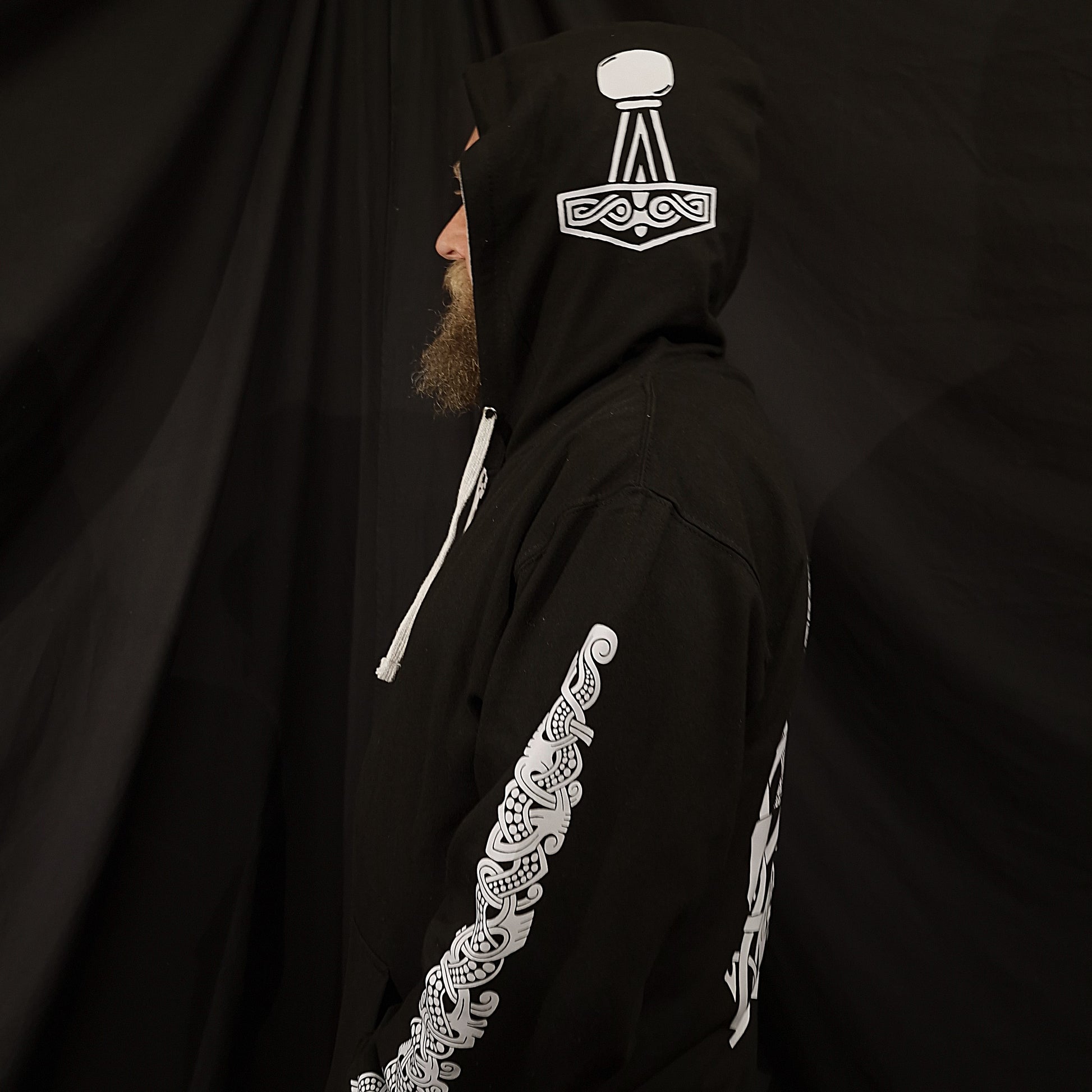 A line drawing of one side of the 'Hamar Is' Mjolnir is detailed on the front of the hoodie and also as a hood print.