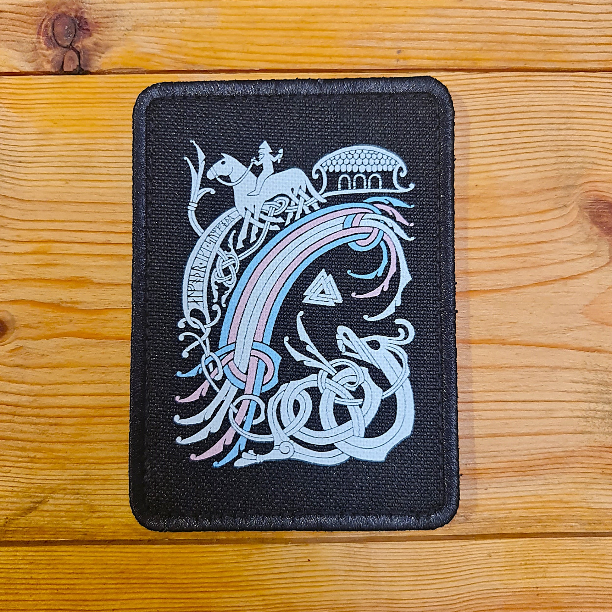 Our popular Bifrost deisgn in the colours of the trans flag printed onto a velcro backed patch.