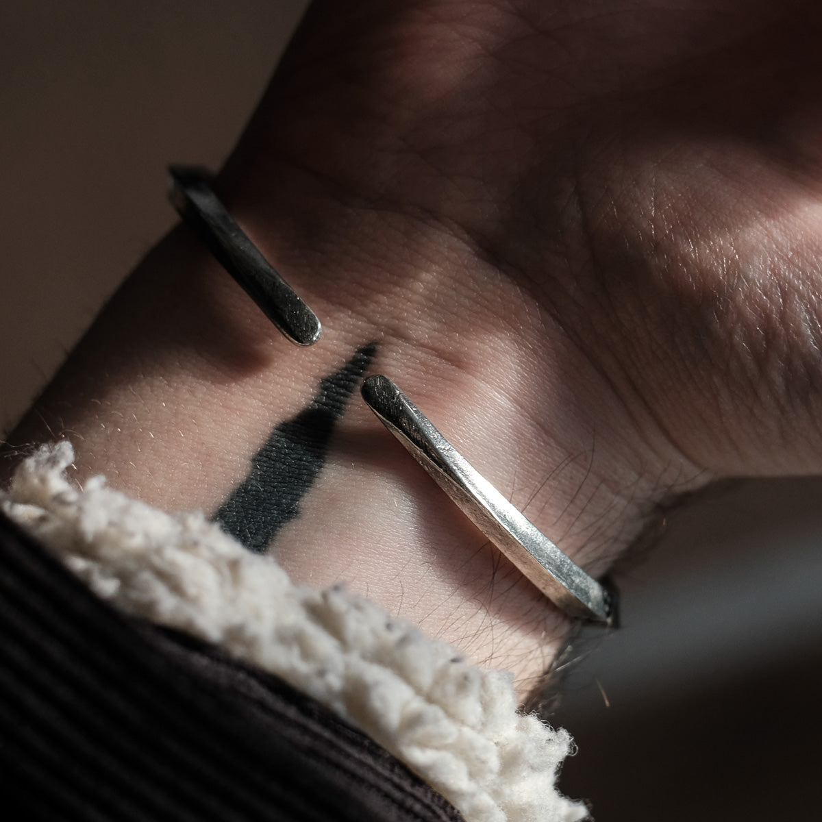 This bracelet is designed to be worn loose and adjustable only once. Please bend with gentle and even pressure so that you can slide the bracelet onto your wrist. Do not adjust further. Avoid wearing in showers and pools as chemicals and soaps can cause the metal to tarnish faster.