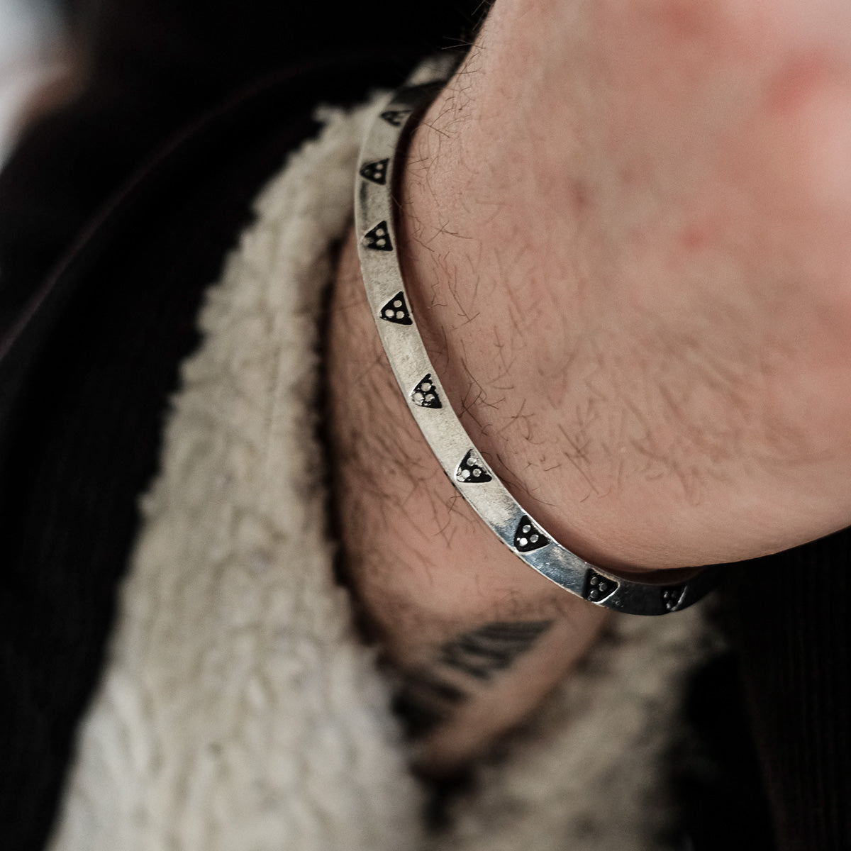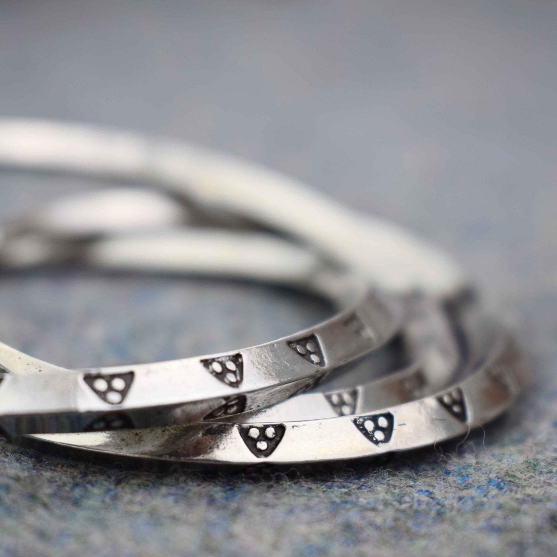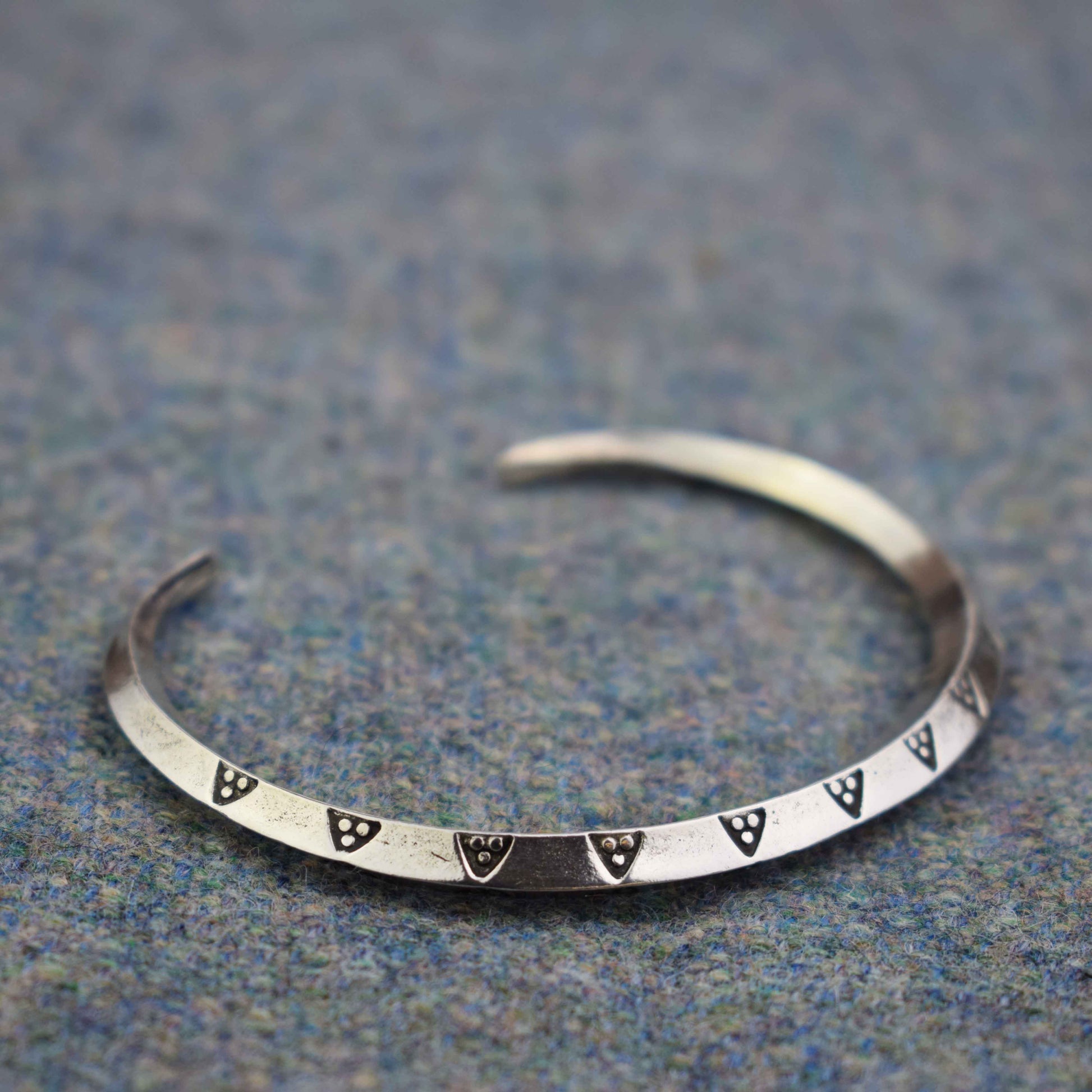 This is a replica of numerous silver bangles from the Viking period. They originally weighed a Viking Ounce (around 25g) and were broken into pieces as a way of paying for goods. Fake ring money cast in a lead/pewter mix have been found in York. Some of these bracelts were plain, and others have patterns on them. This triangular pattern is a common motif on silver finds from the time.