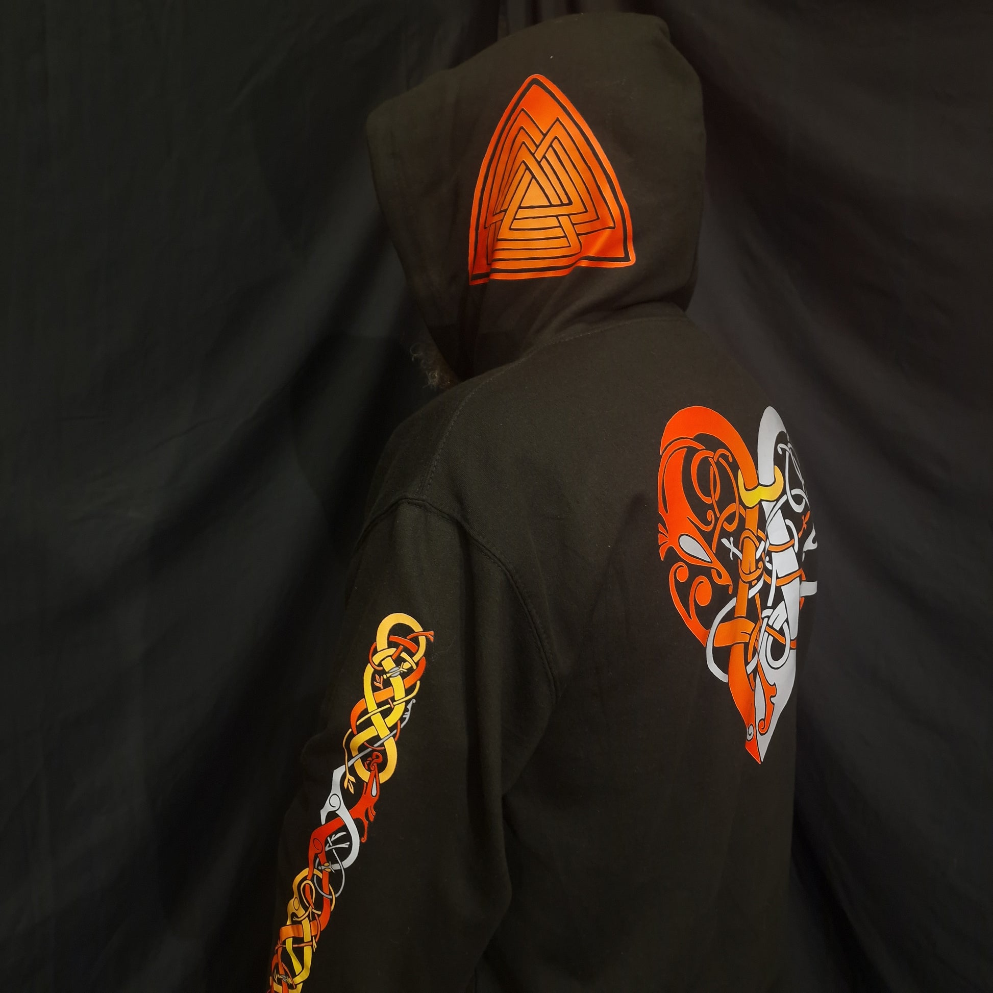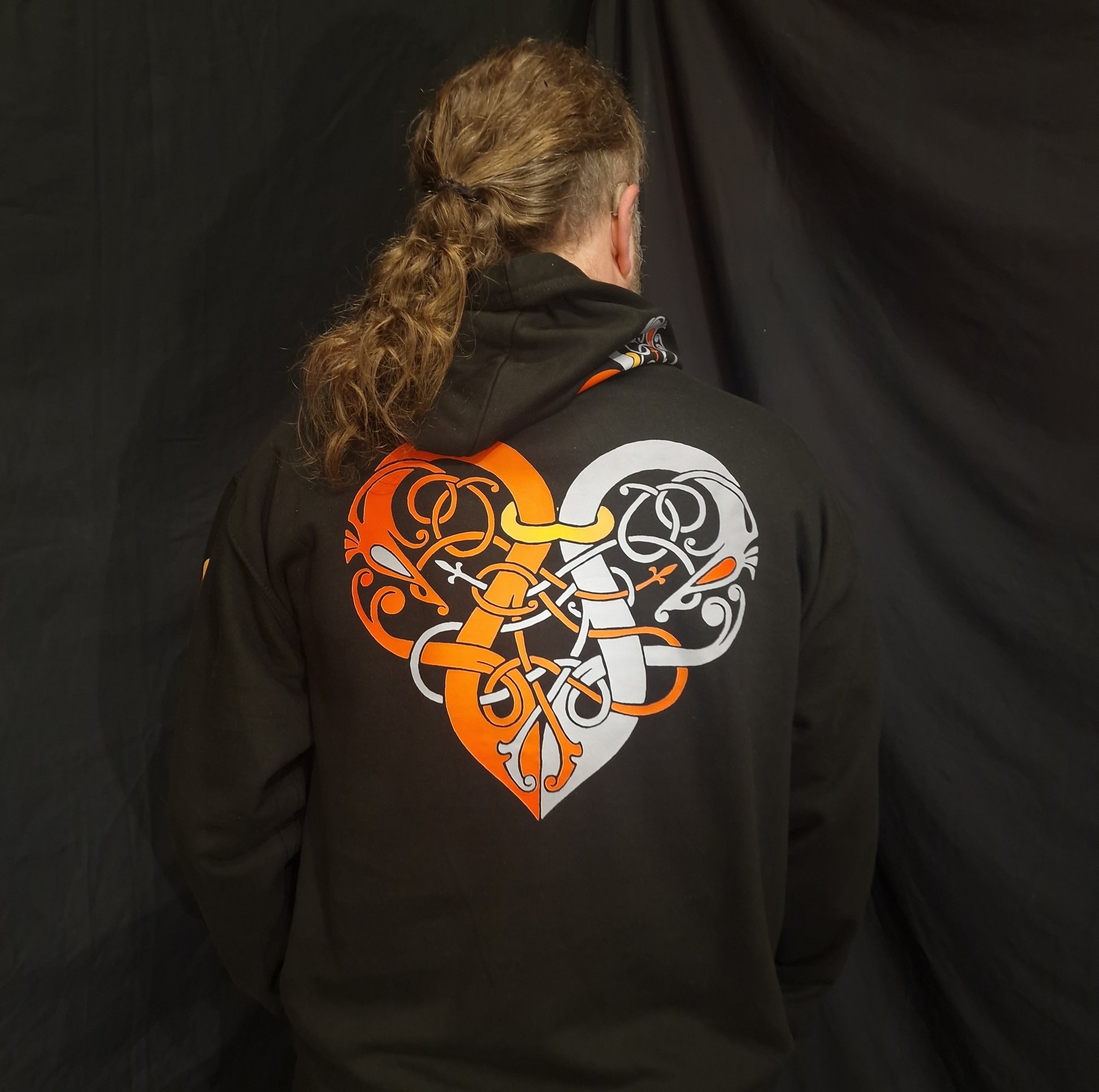 The sleeves feature a new Urnes style knotwork stripe in complementary colours. The hood has a smaller version of the heart on one side and our valknut logo on the other