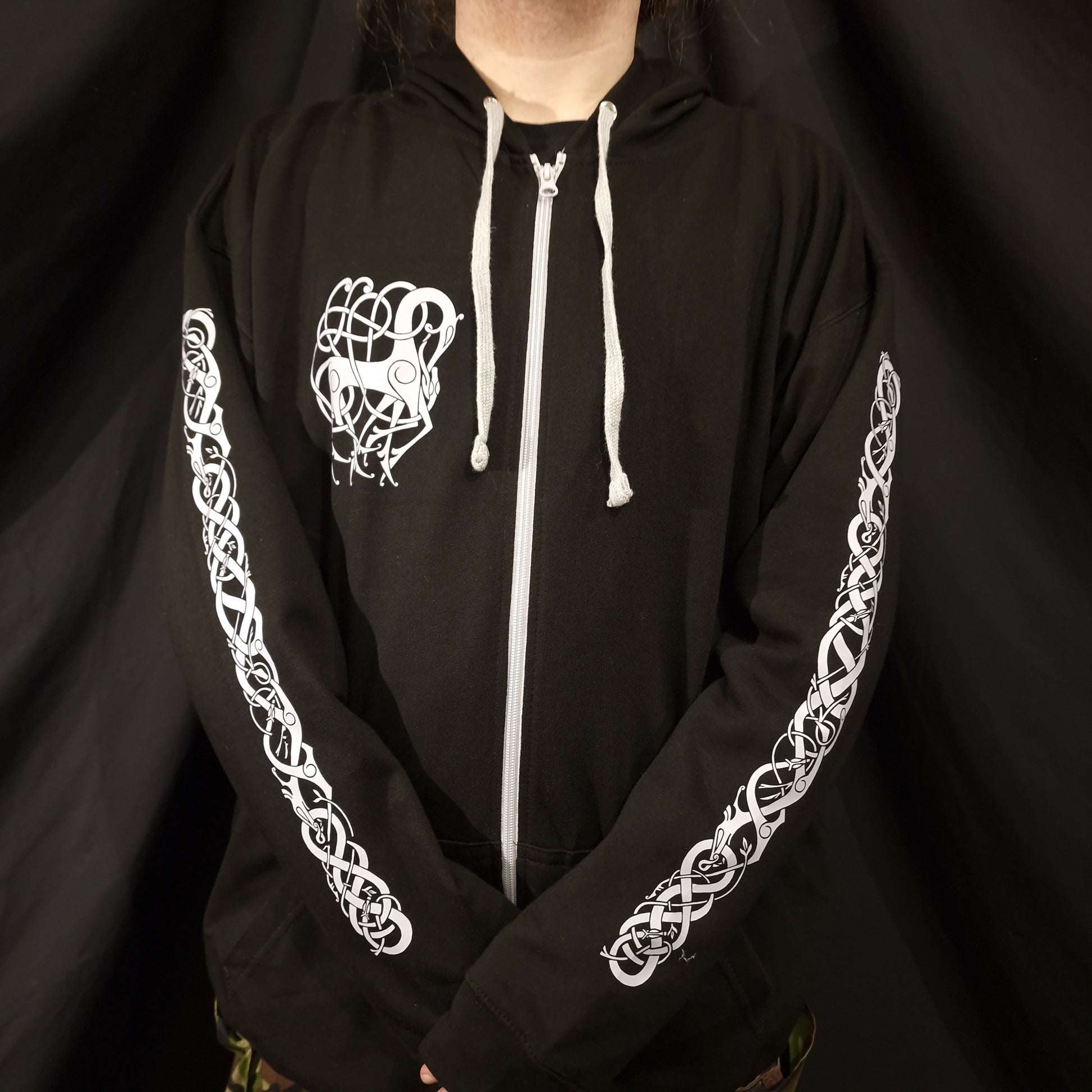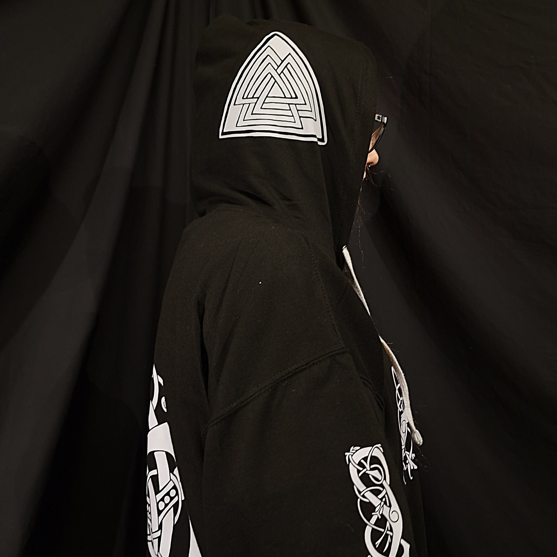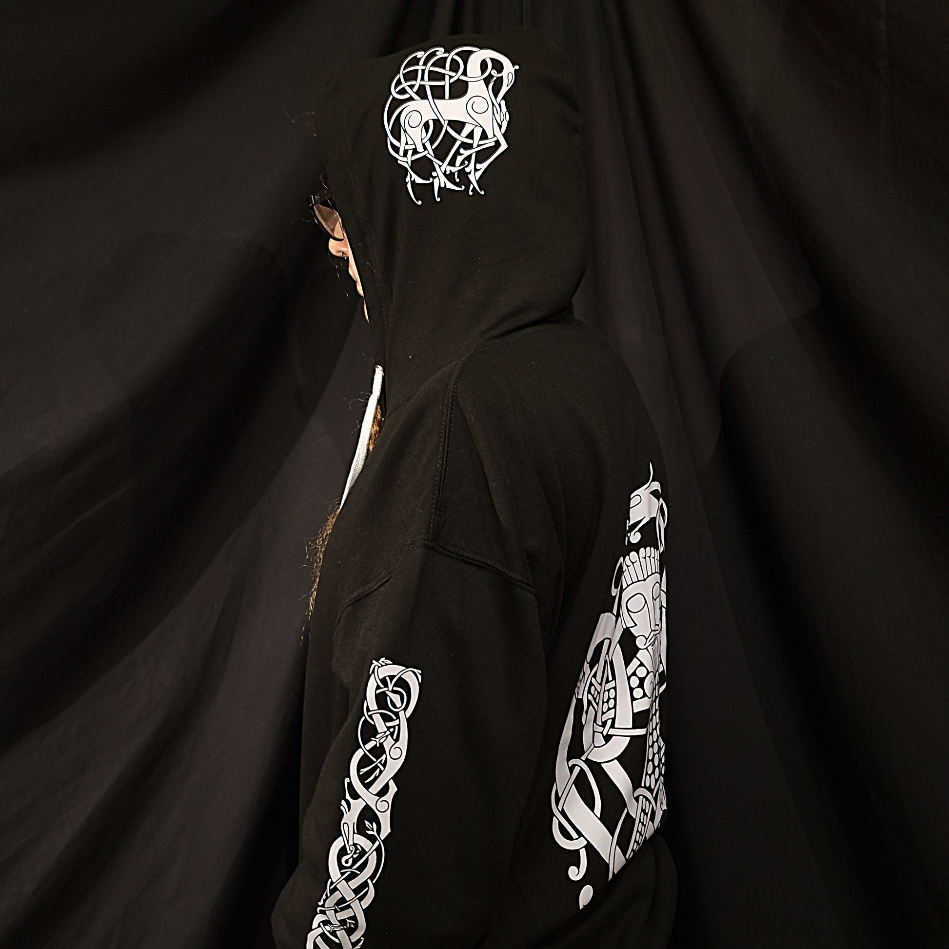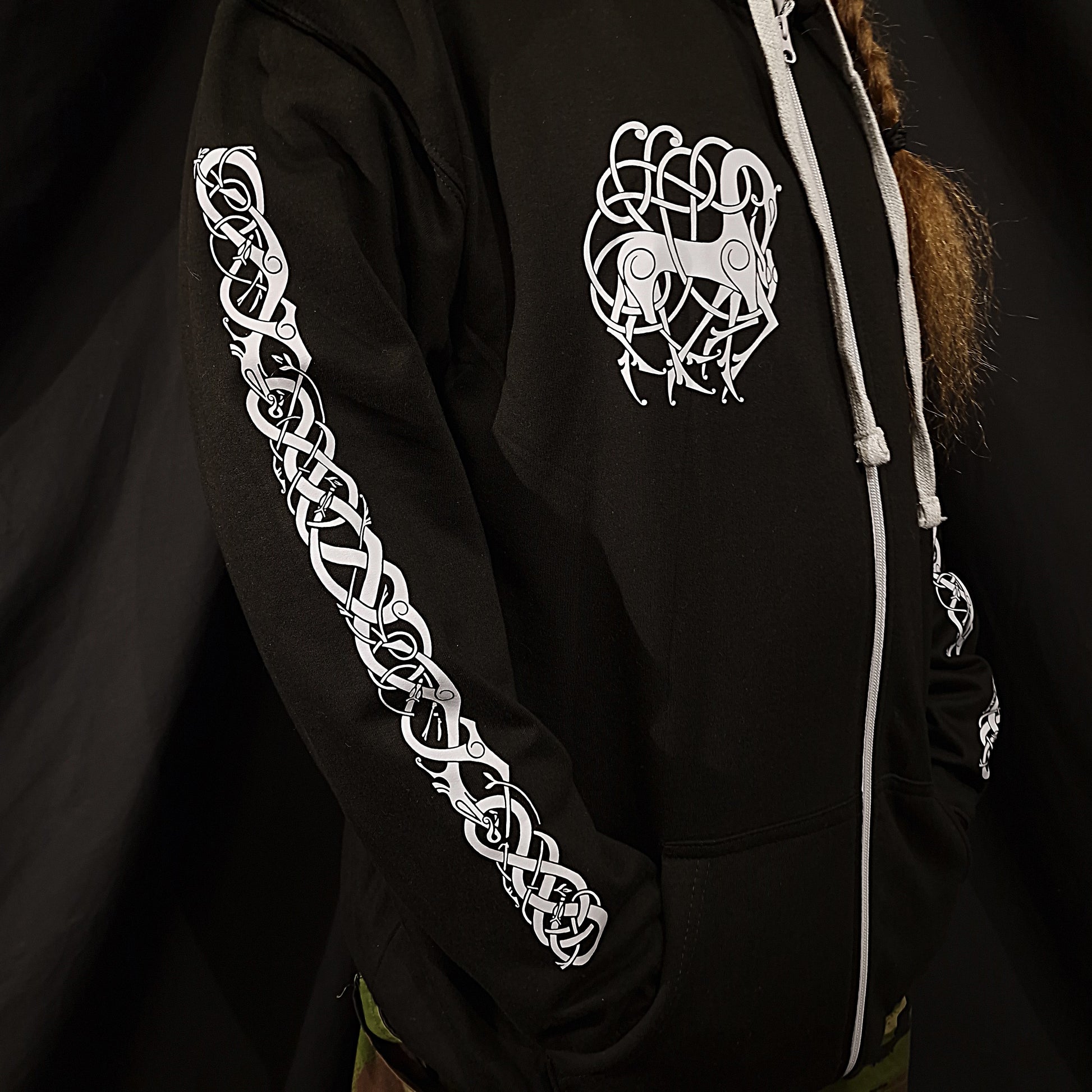 Another of this children, Sleipnir is depicted in the Urnes style as a small front print and as a hood print.